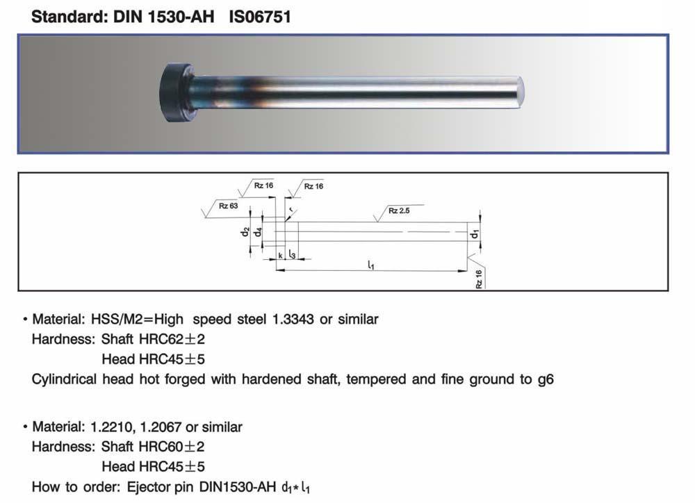 The minimum diameter of pin to be machined isф0.2mm,with the maximum precision up to 0.002mm. Further machining such as chrome-plating and character-engraving is allowed for working end. Unremitting efforts in research has made us the pioneer to make ejector pin with high-speed steel which is of high hardness, high ductility, high grinding resistance and high heat resistance, better for precision mold, capable of increasing the service life significantly, particularly being very effective in controlling the hot deformation for precision mold.