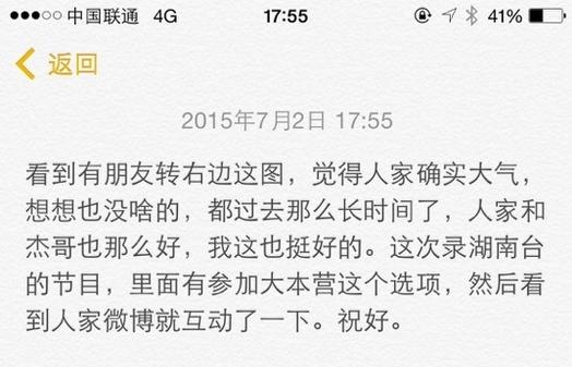 刘烨在微博写道,“看到有朋友转右边这图,觉得人家确实大气,想想也没啥的,都过去那么长时间了,人家和杰哥也那么好,我这也挺好的。这次录湖南台的节目,里面有参加大本营这个选项,然后看到人家微博就互动了一下。祝好。”右边的图是谢娜接受采访,被问及是否会在大本营上与刘烨见面时说的话:“只要他不躲我,我都会去找他,呵呵。”