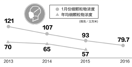 在杭州,每年一月往往是全年空气质量最差的月份。昨天,胡伟报出一个新鲜的数据:刚过去的1月,杭州月平均空气细颗粒物浓度是79.7微克/立方米。这个数据,2015年1月是93,2014年是107,2013年是121。