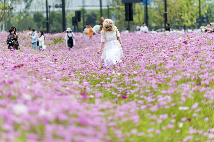 随着天气的逐渐升温,与杭州钱江新城隔江相望的钱江世纪城1300多亩规划地块内,波斯菊、硫华菊、虞美人、金盏菊等鲜花绽放正旺。